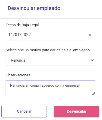 4) Informar la Fecha de Baja Legal, el motivo por el cual se da la baja del empleado y si se desea colocar una observación. A continuación presionar el botón Desvincular.