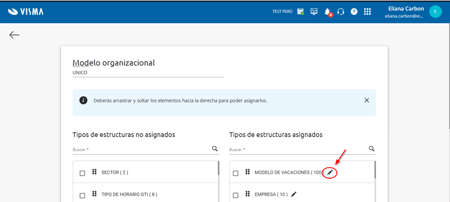 Localizar el tipo de estructura ‘modelo de vacaciones’ y hacer click en la opción para editar: