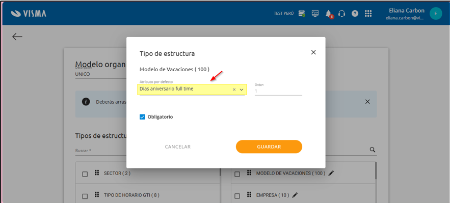 2. En la sección ‘Modelo organizacional’: se asignó automáticamente el modelo configurado por defecto anteriormente. Como control adicional, corroborar que esté asignado el tipo de estructura ‘periodicidad’, caso contrario debe asignarse antes de la generación de días: