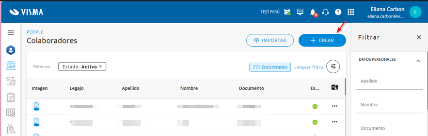 Para poder dar de alta a un colaborador primer debemos Ingresar en People> Colaborador y hacer click en ‘crear’: