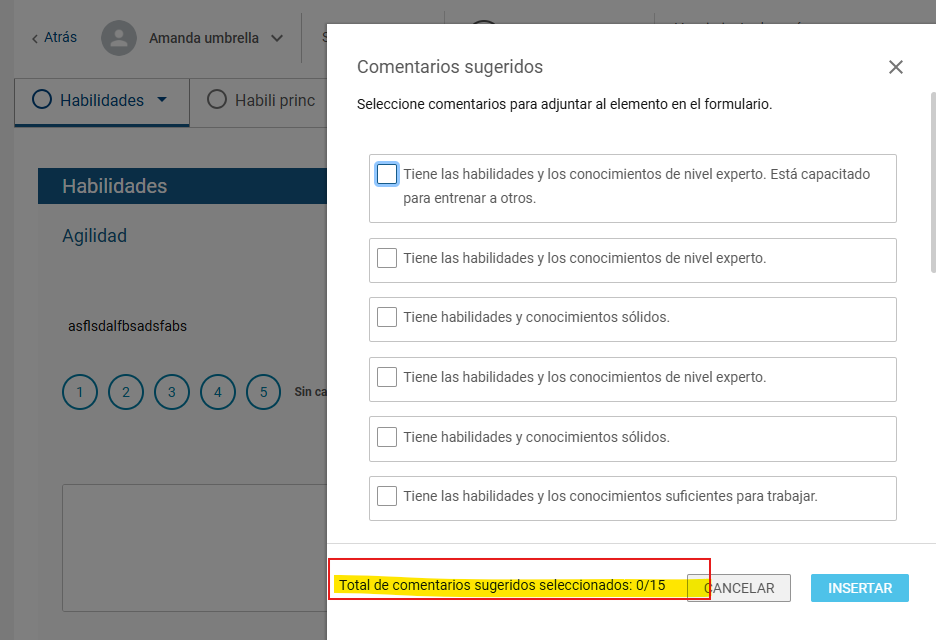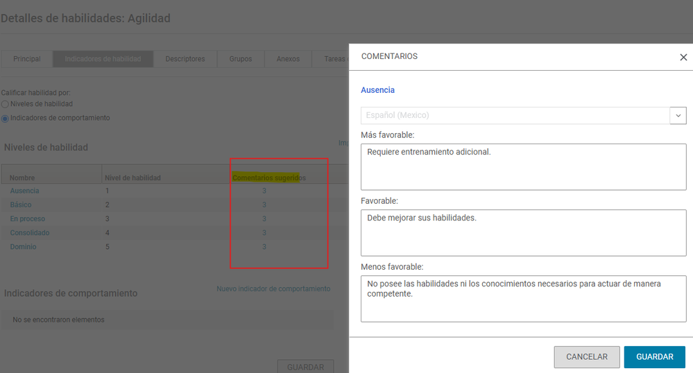 Los comentarios sugeridos solo están disponibles cuando se trabaja con Niveles de Habilidad.