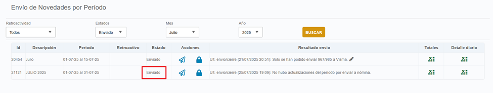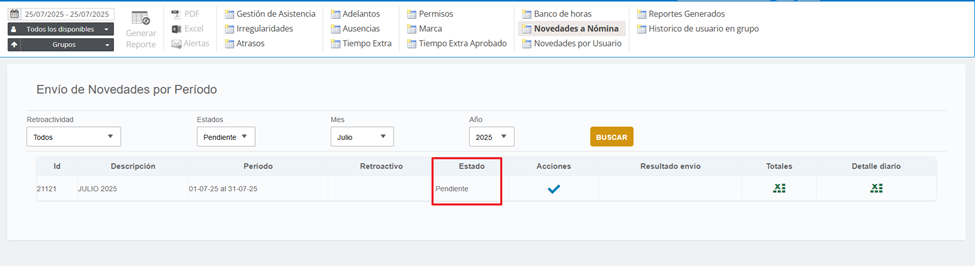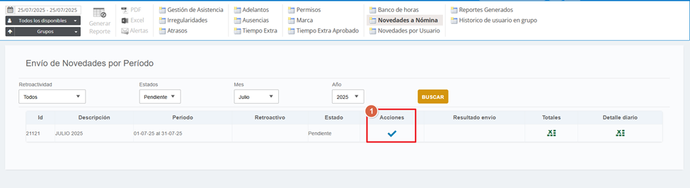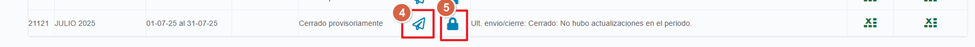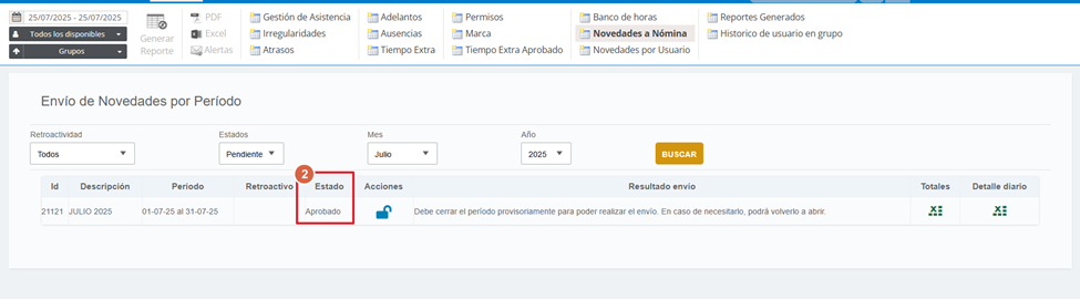 Una vez aprobado, el siguiente paso es cerrar provisoriamente el período. Esto habilita el envío de novedades a Payroll. Para ello, presioná el ícono del candado.