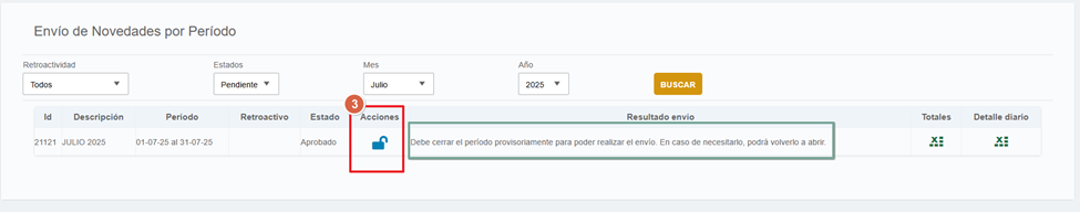 Si hiciste modificaciones en las novedades luego de haberlas enviado, recordá reabrir el período. El estado volverá a "APROBADO", y deberás repetir los pasos anteriores para que se reflejen los cambios correctamente.