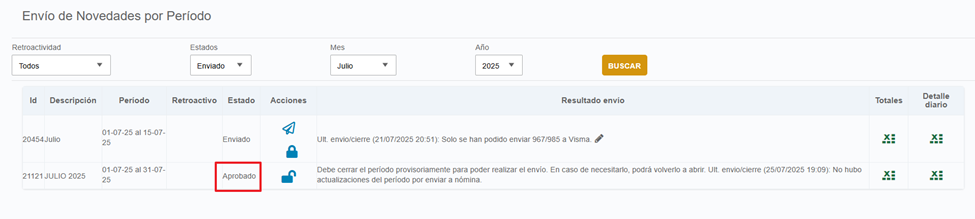 Para avanzar, hacé clic en el ícono de "Aprobar". Esto cambiará automáticamente el estado del período a "APROBADO".