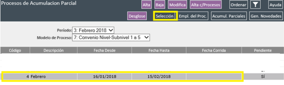 Posicionados en el modelo definido para la acumulación parcial, con el botón SELECCIÓN, elegiremos a los empleados a liquidar.