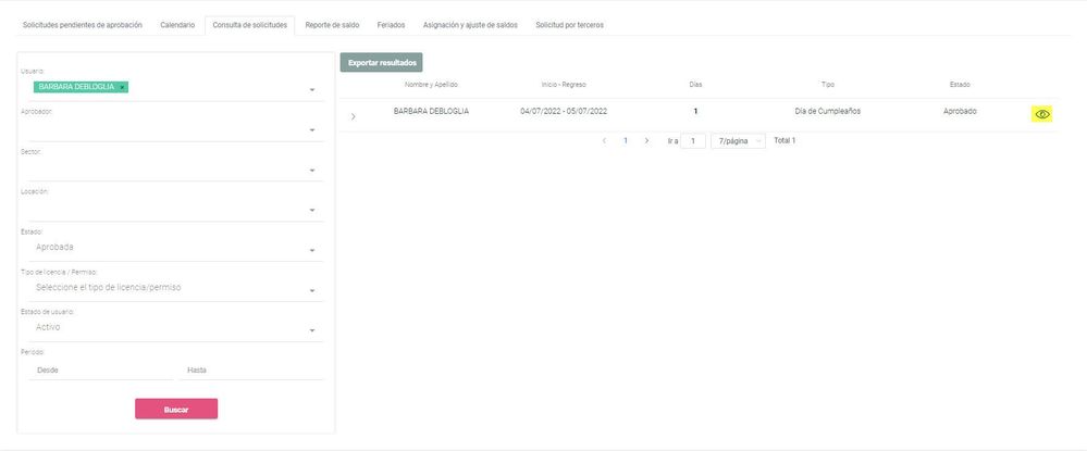 2) Identificar la licencia que se desea cancelar utilizando como filtro de búsqueda el campo Usuario, Tipo de Licencia/Permiso o Estado (Aprobada). Una vez localizada la licencia se deberá hacer clic sobre el icono visualización para ingresar al detalle de la solicitud.