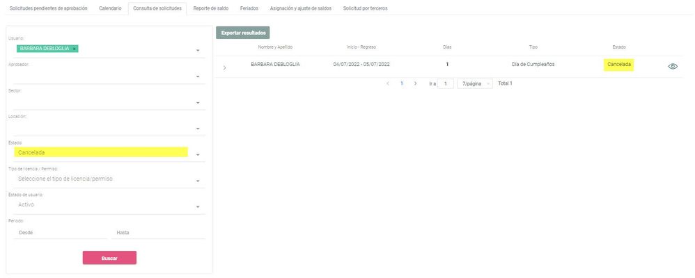 Nota: Una vez rechazada la solicitud se coloca en estado Cancelada y se retorna de forma automática el saldo de la licencia al empleado.