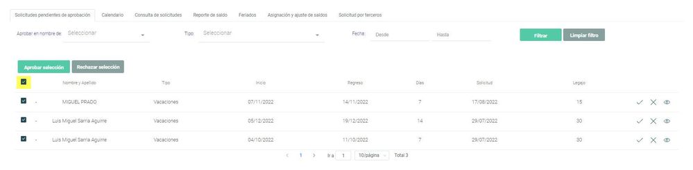 2) Tildar la casilla general que se encuentra situada por debajo del botón Aprobar Selección para seleccionar todas las solicitudes. Una vez seleccionadas, hacer clic sobre el botón Rechazar Selección.