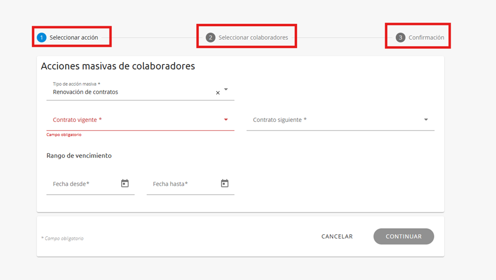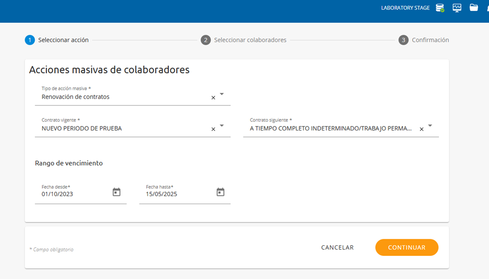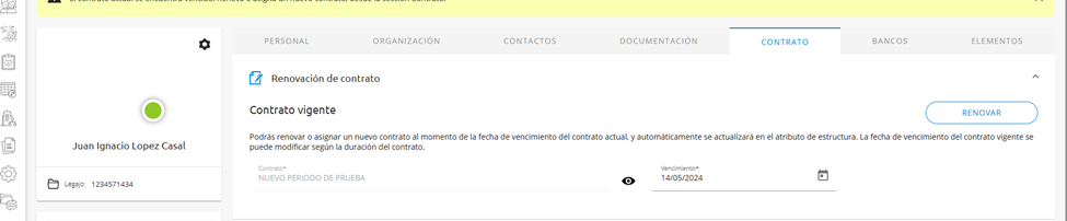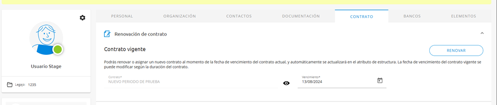 Esta opción se podrá utilizar a partir de un tipo de contrato de tiempo determinado con fecha de vencimiento, para renovarlo por el contrato siguiente o el que se elija, filtrando por los colaboradores que tengan un tipo de contrato cuya fecha de vencimiento esté dentro del rango de fechas indicado.