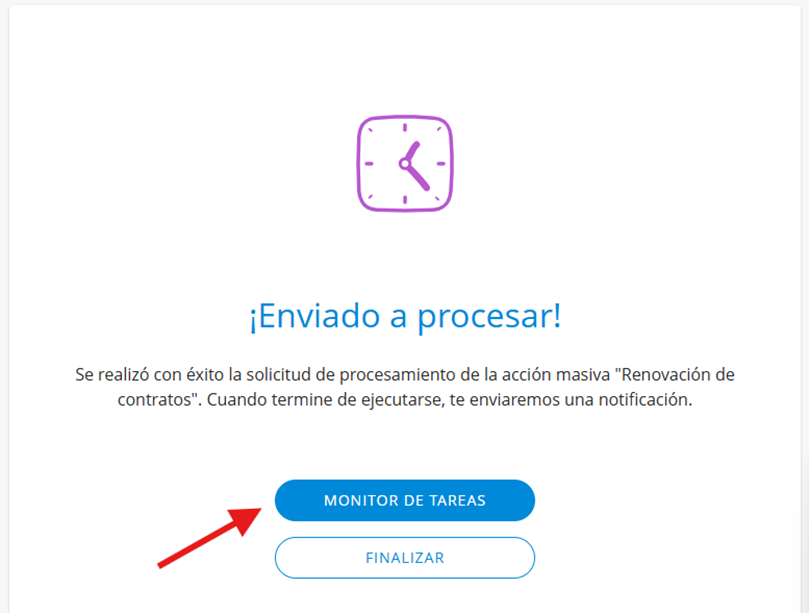 “Se realizó con éxito la solicitud de procesamiento de la acción masiva “Renovación de Contratos”. Cuando termine de ejecutarse, te enviaremos una notificación”.