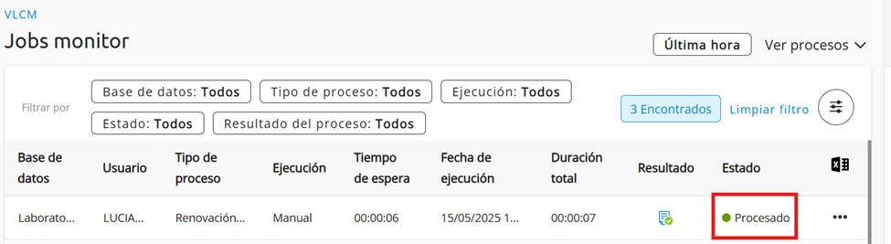 En este caso, podemos observar que los cambios se realizaron satisfactoriamente ya que en estado figura “Procesado” en caso de que en el estado nos indique “incompleto” se deberá hacer clic en los tres puntos para poder descargar el log con los errores.