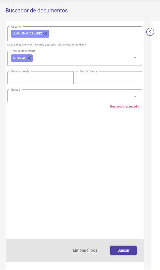 2) Aplicar un filtro que permita obtener la documentación del empleado. Puede utilizarse el campo Usuario, Tipo de documento, Periodo o Estado entre otras opciones.