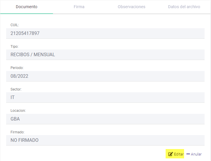 Dentro de la plataforma de TuRecibo es posible editar los documentos en situaciones en la que un empleado cambia su identificador o en el caso de que el mismo se haya cargado por error sobre otra persona.