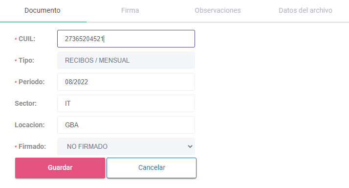 También es posible modificar el CUIL, Periodo, Sector y Locación del documento.