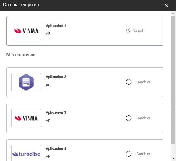 Luego de que se cumplan los requisitos mencionados anteriormente las cuentas se encontraran ya vinculadas, el empleado podrá cambiar de empresa haciendo clic sobre la flecha ubicada en el margen derecho de la interfaz y seleccionar a que aplicación desea ingresar como se indica la siguiente imagen: