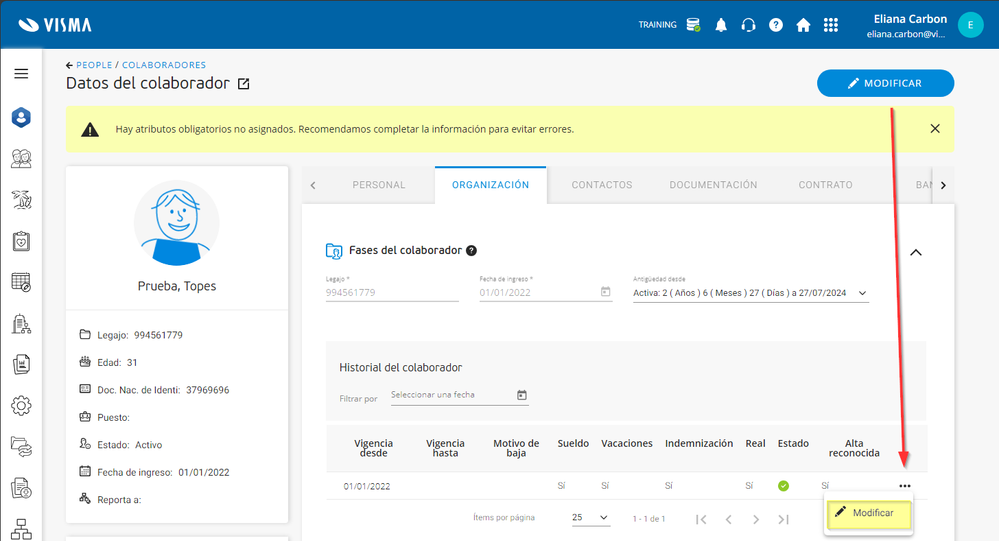 (***) Las fases se encuentra en People> Colaboradores> Legajo X> Tres puntitos> Ver Colaborador> Solapa Organización> Sección ‘Fases del colaborador’. Si se quiere editar el check se debe hacer click en ‘Modificar’ y en la parte derecha se habilitarán los tres puntitos con distintas opciones, una de ellas es ‘Modificar’.