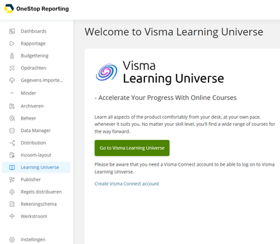 Je kunt een kijkje nemen door links in OneStop Reporting het menu uit te klappen. Daar selecteer je vervolgens het kopje Learning Universe. Met jouw bestaande Visma Connect account log je hier gemakkelijk in. Heb je nog geen Visma Connect account dan kun je deze aanmaken door in het menu te klikken op ‘Create Visma Connect account’.