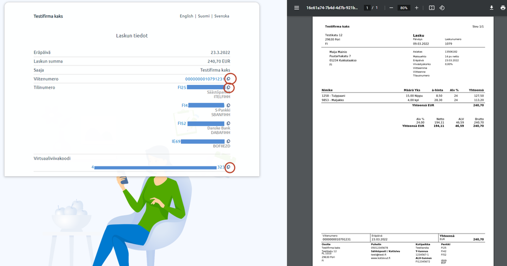 Laskun tiedot sekä virtuaalinen viivakoodi ovat nyt kopioitavissa suoraan sähköpostista. Näin maksaja välttyy tietojen käsin näpyttelemiseltä verkkopankkiin.