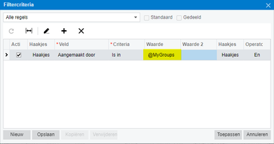 De werkgroep(en) waarvan de ingelogde gebruiker een lid is (exclusief onderliggende groepen). Gebruik hierbij de condities "In" en "Niet In". De inrichting van de werkgroepen is terug te vinden in het venster Organisatiestructuur. |