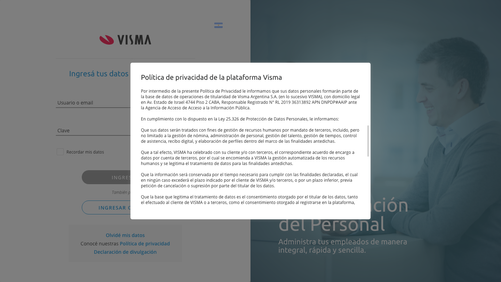Nos interesa que nuestros clientes estén informados del trato que tendrán sus datos personales, y queremos asegurarnos de que tomen las decisiones que consideren adecuadas al acceder a la plataforma Visma. Siempre que lo necesites podrás consultar nuestra política de privacidad, y por única vez y por cada base de datos, cuando desees ingresar a la plataforma, solicitaremos tu consentimiento.
