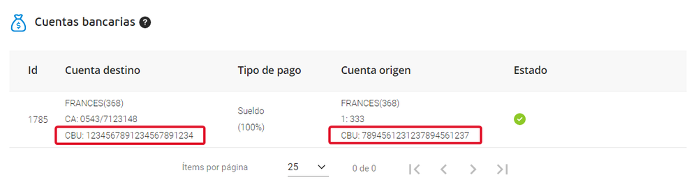 Para las bases de Argentina, se agregó la visualización del número de CBU de la cuenta bancaria origen y destino configuradas en los datos del colaborador, solapa Bancos.