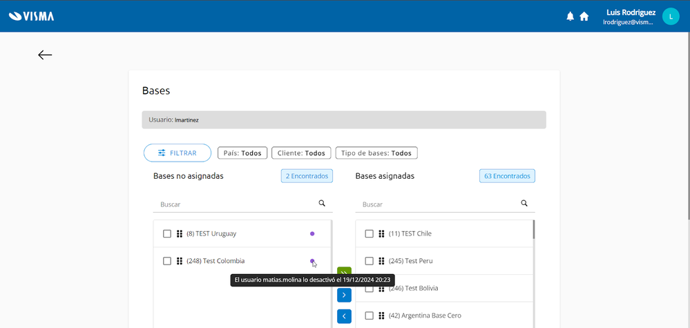 En la administración de usuarios, se añadió un punto violeta informativo en la sección Bases para indicar las bases desactivadas por un usuario administrador. Este punto muestra el nombre del usuario que realizó la desactivación y la fecha correspondiente.