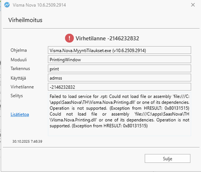 KORJATTU!Sovelluspalvelussa tulostaminen ei onnistu 30-10-2025 07:48 (Päivitetty 30-10-2025 08:30) Vastaukset 0 kehut 0 Näytöt 91 Nova