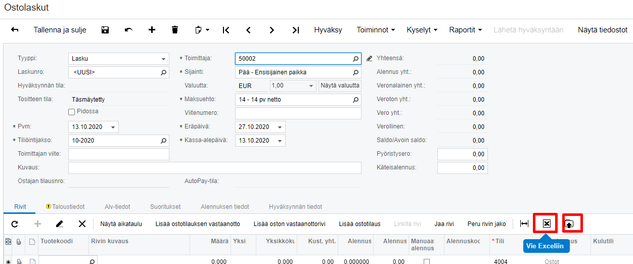Rivitietojen tuomiseen voit ladata mallin lisäämällä rivin ostolaskulle ja klikata Vie Exceliin nappia. Tuonti on oikeanpuoleinen painike.