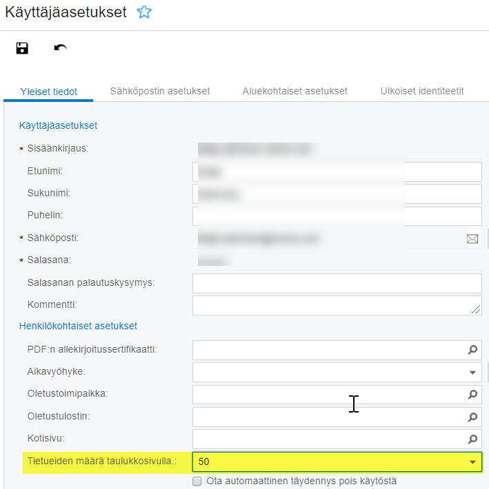 Käyttäjä pystyy määrittelemään käyttäjäkohtaisissa asetuksissa, kuinka paljon rivejä tulee näkyviin rivinäkymiin. Asetus määritellään avaamalla Omat ERP-tiedot -näkymä