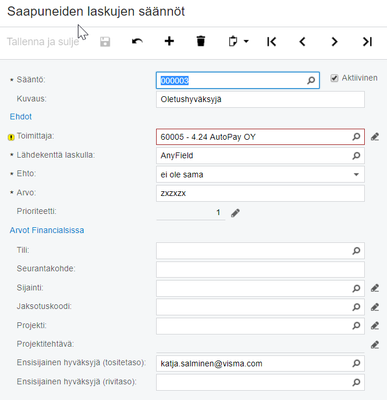 Määrittämällä toimittajalle alla olevan kuvan mukaisen säännön saadaan määriteltyä toimittajalle ensisijainen oletushyväksyjä. Arvo-kenttään määritellään arvo, jota ei tule verkkolaskusanomassa, esim. zxzxzx.