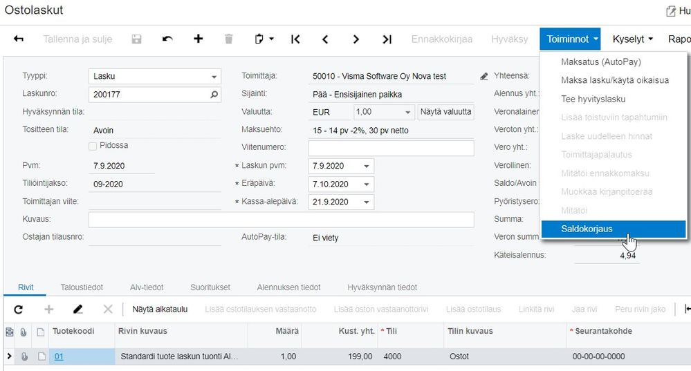 Ostolaskun toimintovalikkoon lisätty Saldokorjaus-toiminto. Toiminto on aktiivinen, mikäli ostolaskun avoinna oleva saldo on pienempi kuin mitä on asetuksiin määritelty saldokorjausrajaksi.