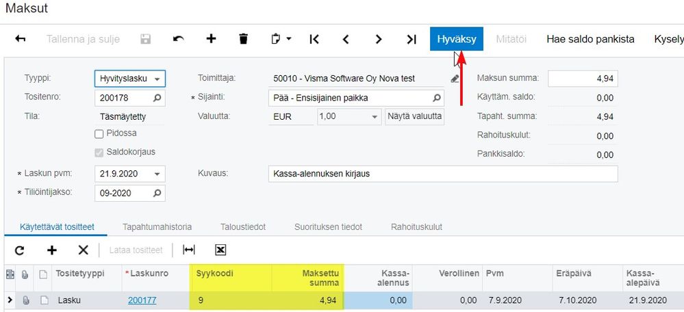 Valitsemalla Saldokorjauksen, aukeaa ostoreskontran maksut ruutu mihin annetaan saldokorjauksen tiedot eli syykoodi ja maksettu summa ja hyväksytään tapahtuma kirjanpitoon Hyväksy-painikkeella