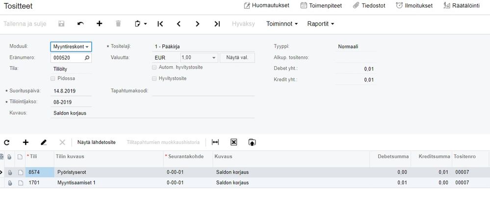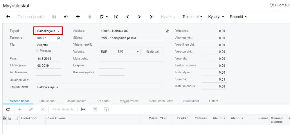 Saldokorjaus-ajo muodostaa uuden tapahtuman Saldokorjaus-tyypillä(ja maksu menee Suljettu-tilaan) ikkunassa Myyntireskontra | Tapahtumat | Myyntilaskut.