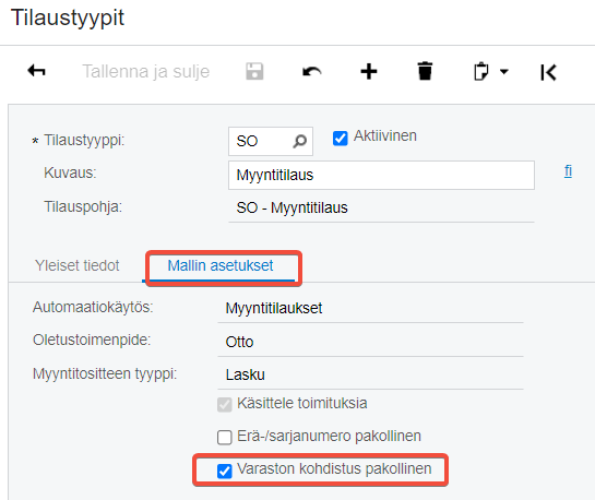 Toimitettavissa olevassa saldossa ei huomioida kirjattuja myyntitilausrivejä mikäli niitä ei ole kohdistettu. Myyntitilausrivin kohdistaminen tarkoittaa saldon varaamista kyseiselle myyntitilaukselle. Tilausrivin kohdistamisen voi tehdä manuaalisesti myyntitilauksella tai tilaustyypin taakse voi laittaa asetuksen, jolla tämä tapahtuu aina automaattisesti tilauksen kirjaamisen yhteydessä