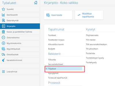 Uudet tilijaksot muodostetaan kirjanpidon rekisterien Tilijaksot-näytössä.