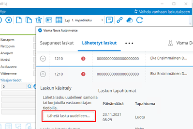 Vaikka lasku ei olisi mennyt perille loppuasiakkaalle niin lähetyshetkellä siitä muodostuu silti toimeksianto Visma Financial Solutions Oy:lle joten tästä syystä et voi lähettää samaa laskua enää uudelleen Nova Laskutus-ohjelmasta Laskuta-näkymän kautta. Alla toimintaohjeet riippuen siitä onko loppuasiakkaalle mennyt alkuperäinen lasku perille vai ei.