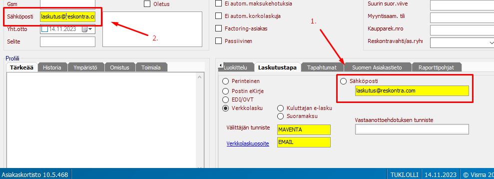 Jos laskuja lähetetään sähköpostitse tai tulostuspalveluun Autoinvoice palvelun kautta tulee näiden asiakkaiden tiedot olla syötettynä alla olevan ohjeen esimerkin mukaisesti. Jos käytetään tulostuspalvelua tai sähköpostilaskujen lähetystä Autoinvoicen kautta menevät ne käytännössä verkkolaskuaineiston muodossa Novasta eteenpäin joten siksi niihin pätee samat säännöt kuin normaalissakin verkkolaskuaineistossa. Vastaanottajan sähköpostiosoite haetaan ensisijaisesti Asiakaskortiston oikean laidan Laskutustapa: Sähköposti- kentästä, jos tätä ei ole syötetty haetaan sähköpostiosoite kuten ennenkin yhteyshenkilön takaa kunhan se on haettuna laskun Viitteenne kenttään.