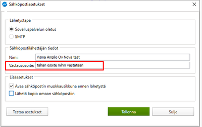 Nykyisessä versiossa mikä sovelluspalvelusta löytyy on sähköpostiasetuksissa kenttä Vastausosoite johon laitetaan säpo mihin vastataan. Eli kun vastaanottaja postin saa ja siihen vastaan niin tuo määritelty vastaanottajan osoite tulee.
