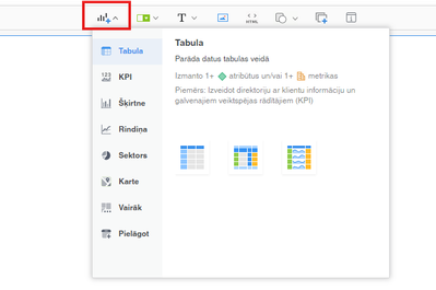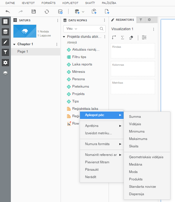 Datu analīze: sadaļā "Datu kopas" (Data sets) būs redzami atlasītie datu objekti. Ja nepieciešams datus pielāgot, piemēram, grupēt, filtrēt un sortēt vai veikt aprēķinus, to var izdarīt uz konkrētās metrikas spiežot peles labo taustiņu.