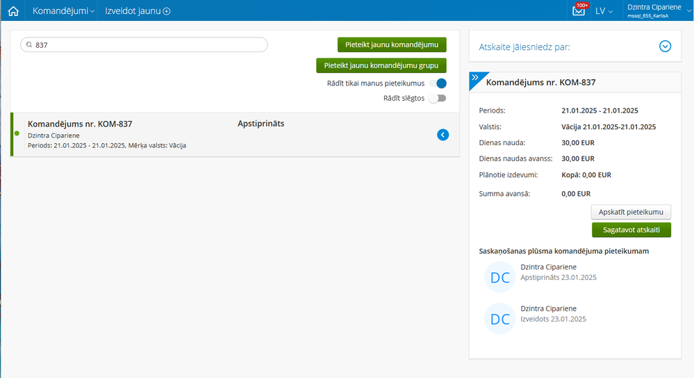 Komandējumu sadaļā "Atskaite jāiesniedz par" uzklikšķinot uz komandējuma atvērsies detalizētais skats ar pogu "Sagatavot atskaiti".