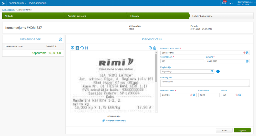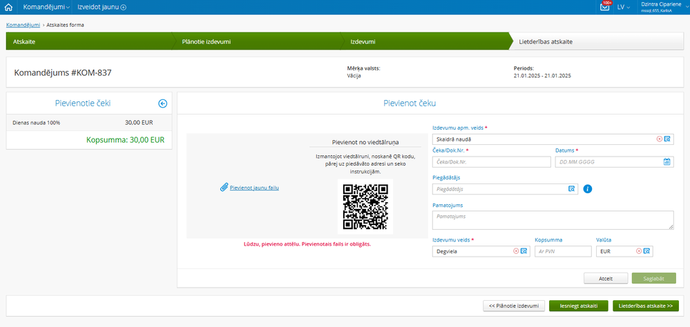 Kad visa nepieciešamā informācija ir norādīta un izdevumi pievienoti, lietotājs nosūta atskaiti saskaņošanai.