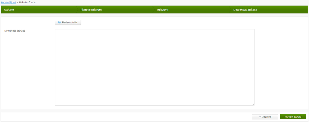Sadaļā "Lietderības atskaite" lietotājs var pievienot failu ar lietderības atskaiti vai arī manuāli aizpildīt sadaļā pieejamo teksta lauku.