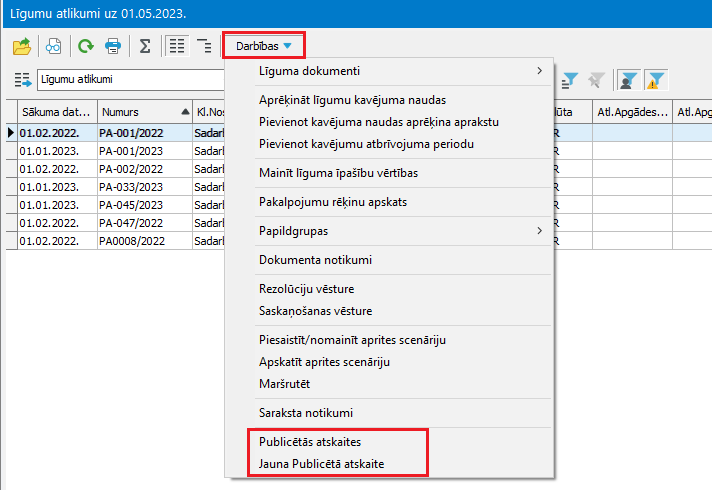 Saraksta vai atskaites izvēlnē Darbības pieejamās iespējas: