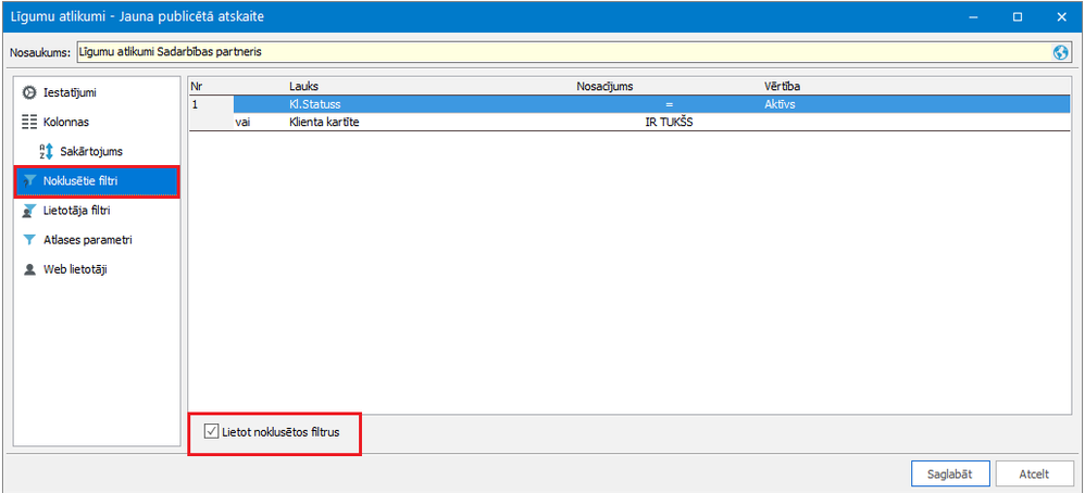 Noklusēto filtru nosacījumi nav labojami. Ja tos nav nepieciešams pielietot, ir jāizņem atzīme <Lietot noklusētos filtrus>.