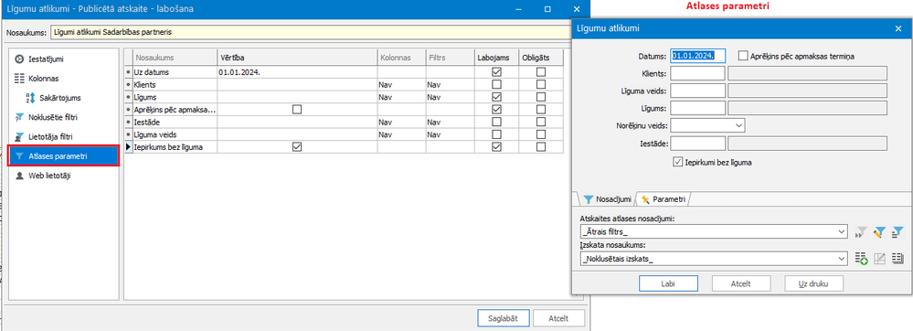 Sadaļa pieejama tiem sarakstiem un atskaitēm, kuriem atlases parametri ir izveidoti un piesaistīti no sistēmas puses.