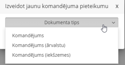 Nospiežot pogu “Pieteikt jaunu komandējumu” lietotājam ir jāizvēlas atbilstošais komandējuma pieteikuma tips: