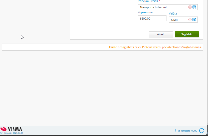 Saskaņojot izdevumus, ja faktiskā summa EUR atšķiras no summas uzskaites valūtā pēc Latvijas Bankas kursa, tiks parādīts brīdinājums. Uzbraucot ar peli uz brīdinājuma, tiks parādīts skaidrojums ar abām summām.
