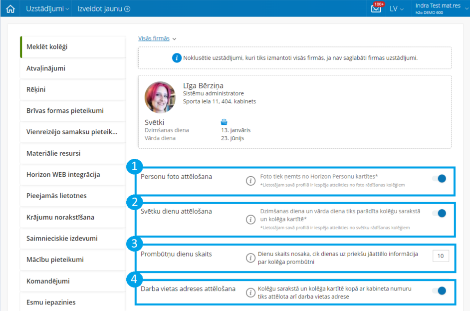 4. Darba vietas attēlošana: var izvēlēties, vai tiks attēlota darbinieka darba vietas adrese.