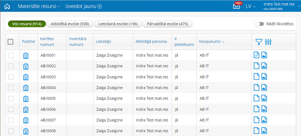 Materiālo resursu sarakstā kopā tiek attēloti HoP lietotāja atbildībā, lietošanā vai pārvaldībā esošie pamatlīdzekļi, ārpusbilances pamatlīdzekļi un inventārs.