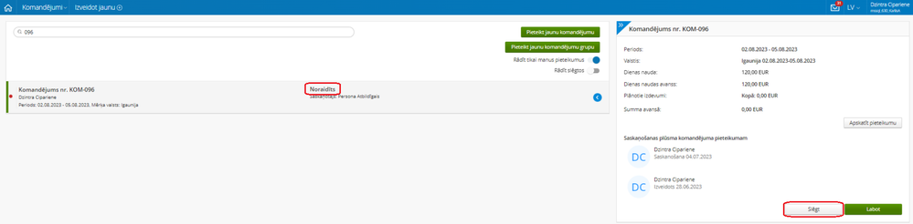 Noraidīts komandējuma pieteikums HoP ir pieejams pieteikumu sarakstā ar darbību “Slēgt”.